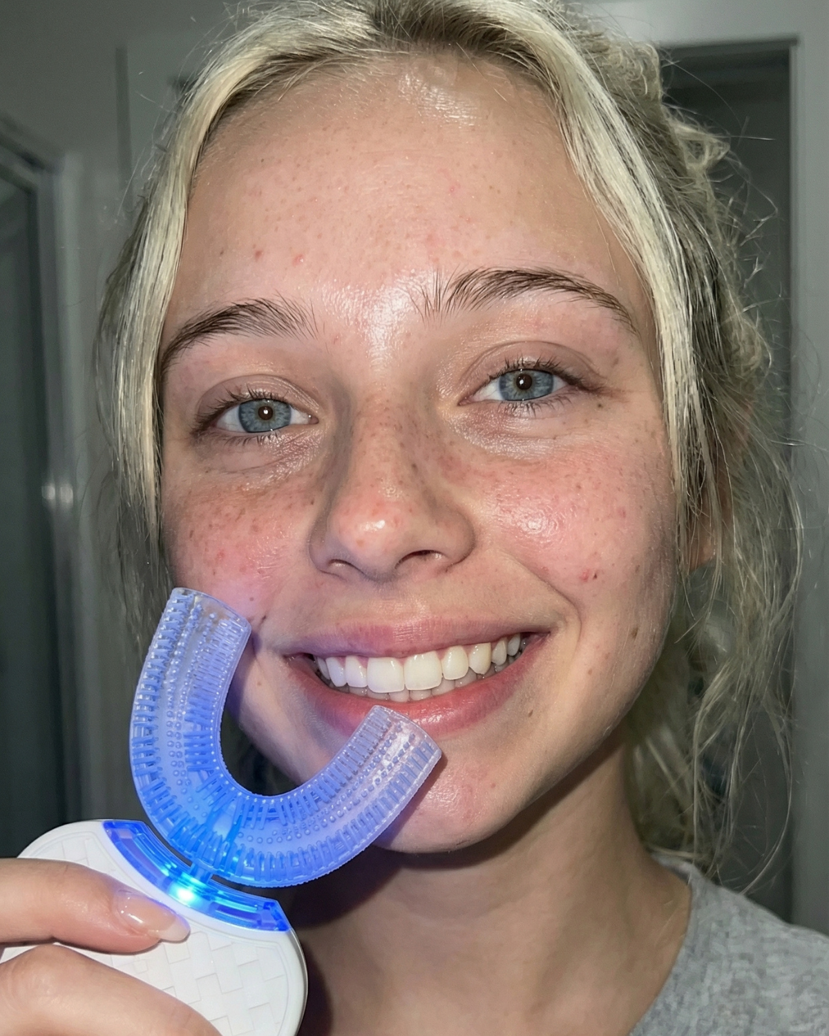 Apply toothpaste to the U-shaped mouthpiece, covering both sides.